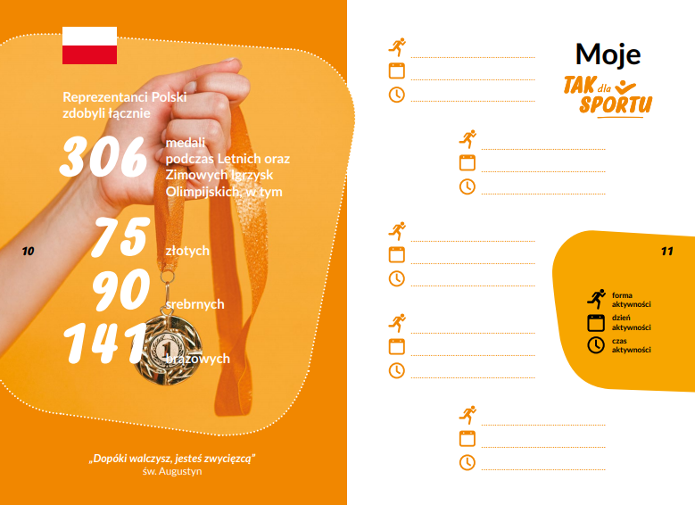 Broszura zawiera wiele cennych i praktycznych przesłań. Na 12 stronach publikacji można znaleźć przede wszystkim korzyści płynące z uprawiania sportu. Wśród informacji znalazły się też sportowe i zdrowotne ciekawostki. Całości dopełniają inspirujące cytaty. Ciekawym rozwiązaniem jest umieszczony na stronie 11 kalendarz, który pozwoli zaplanować rozkład aktywności na cały tydzień, co pozwoli każdemu na kontrolę postępów w różnych dyscyplinach sportu.