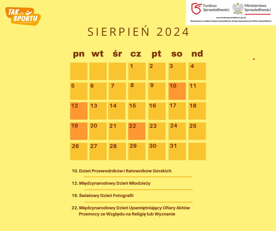 Jakie mniej znane, a istotne społecznie okoliczności pojawiają się w sierpniu? Przyglądamy się w szczególności tym, które w różnych aspektach mają odniesienie do trwającej kampanii „TAK dla sportu, NIE dla agresji i przestępczości” sfinansowanej ze środków Funduszu Sprawiedliwości, którego dysponentem jest Minister Sprawiedliwości.