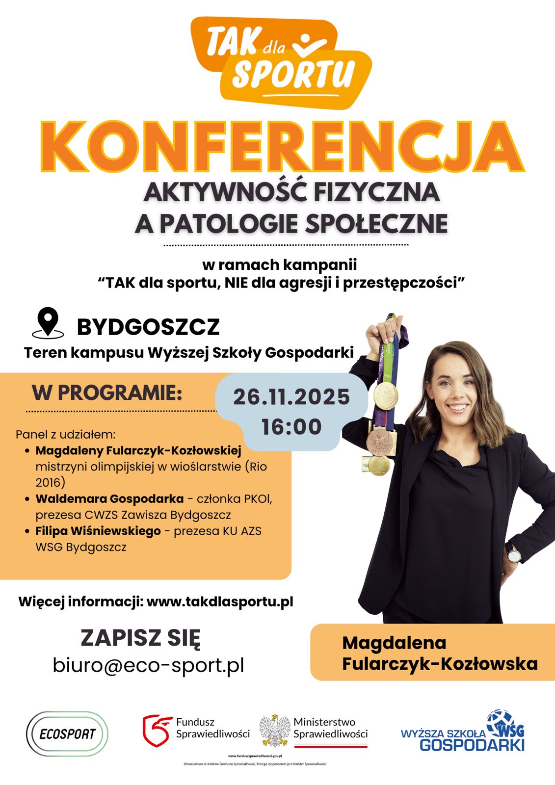 Z reprezentantką Polski będzie można spotkać się już w środę 26 listopada o godzinie 16:00 na terenie Wyższej Szkoły Gospodarki w Bydgoszczy. W panelu dyskusyjnym, przeznaczonym dla rodziców, trenerów, wychowawców, nauczycieli czy studentów, udział wezmą także: Waldemar Gospodarek, członek Polskiego Komitetu Olimpijskiego i prezes CWZS Zawisza Bydgoszcz, oraz Filip Wiśniewski, prezes Klubu Uczelnianego AZS WSG Bydgoszcz. Pozwoli to na ukazanie problematyki z różnych perspektyw, pamiętając, że głównym efektem wiedzy przekazanej uczestnikom ma być redukowanie poziomu patologii społecznych, np. uzależnień od substancji chemicznych wraz z maksymalnym ograniczeniem coraz częściej występujących współcześnie uzależnień od nowych multimediów wśród młodych osób.